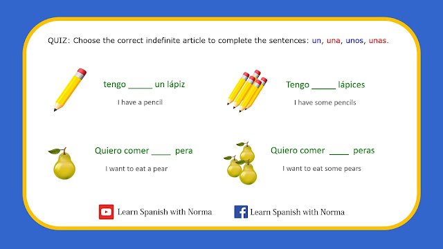 Quiz: Based on your knowledge of the Spanish language so far, try to figure out which Spanish indefinite article to use for each sentence (image below)